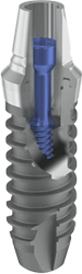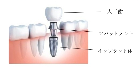 ●インプラント体 顎の骨にインプラントを挿入し、骨とインプラントが結合するのを待ちます。 ●アバットメント 骨とインプラントがしっかりと結合した後、埋入したインプラントに、アバットメントという人工歯とインプラントを連結するパーツを装着します。 |